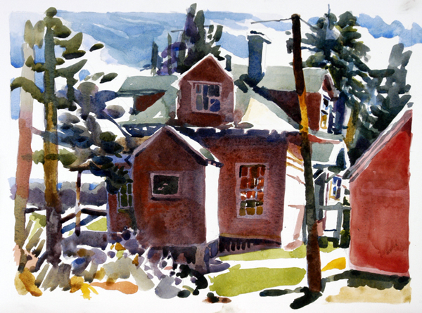 Thursday was a good day. We got a late start and painted once again at Bob’s place on Marshall Point. I began a drawing of a neighboring house which had a great architectural feel to it. It is one of those dark red houses that you see so much of up here. David’s assistant, Christy Gallagher, also chose it as a subject matter and we discussed how it had a sort of mysterious air about it. Christy did a terrific painting of it. There were several of us painting and it was probably a good thing that the house is a vacation home and no one seemed to be there at the time.