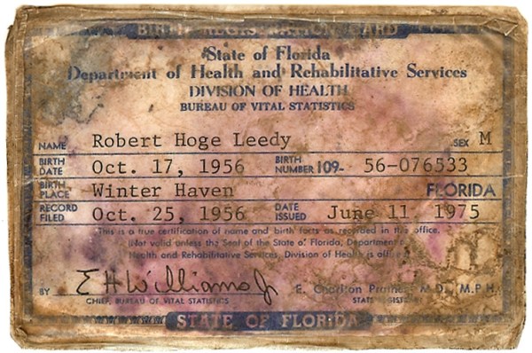 Robert Leedy's birth certificate copy issued in 1975 by the State of Florida and found in 2011.