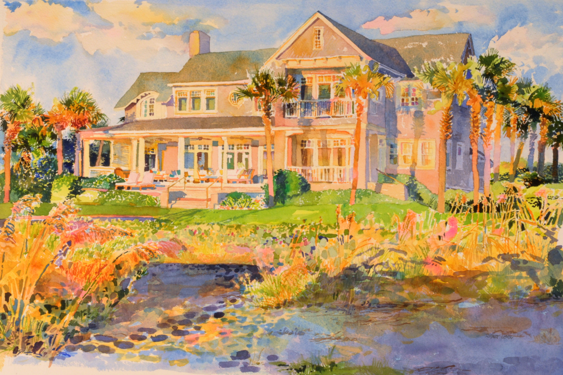 Artistic liberties were taken – such as the removal of the next door neighbor’s house to the south. I replaced it with palm trees, palmettos and bushes. No problem. We disagreed on the wooden walkway and stairs – a public access – that intersected the foreground in the lower right of my potential composition; I argued that the play of morning light on the railing and stairs would create interesting contrasts of pinkish-orange and blue shapes that would add to the overall appeal of the painting AND help break up some of the space of the expansive foreground. The client was concerned that it would take away from the view of the house. He was footing the bill so, he won that argument.