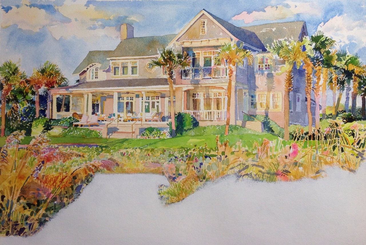 I was commissioned to paint a watercolor of a beach house in Ponte Vedra Beach, Florida. I drove out early one morning and spent several hours photographing the house in beautiful, early morning light. The house is an impressive structure set along sand dunes, sea oats, and wild prickly pear cacti with a wonderful view of the Atlantic Ocean. Happy with the shots, I went back to the studio and began painting, “A Place in the Sun”, a watercolor on a full sheet of Arches 300 lb. Cold Press paper.