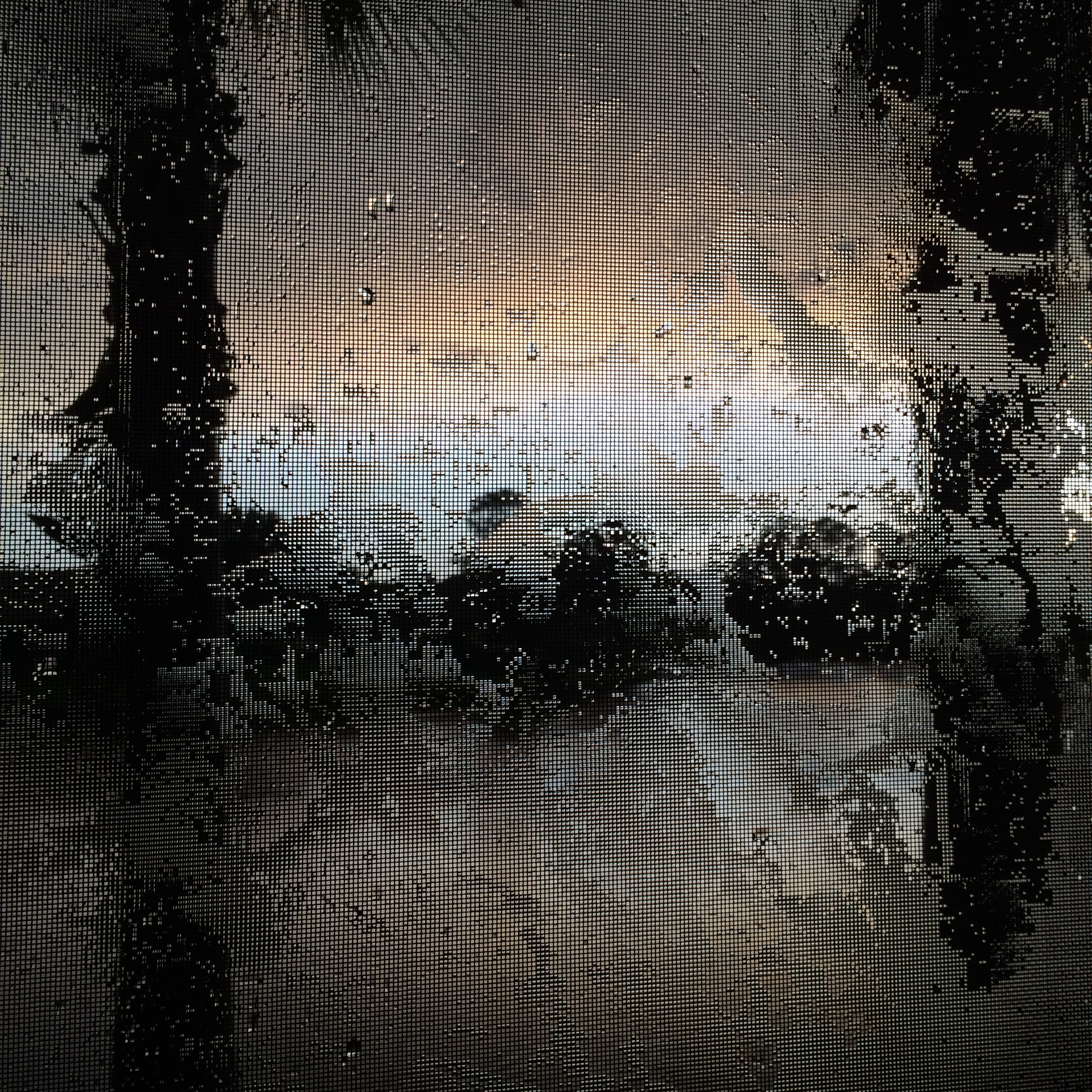 NOTES ON THE PHOTOS: All photos below were taken with an iPhone 5s and are unedited images – no App filters, no Photoshop. It’s not that I don’t manipulate images – I do – I have a gazillion photo editing Apps on my iPhone and I actually do use about half of them. I just want to illustrate how nicely these raw images appeared. I find my iPhone’s camera to be a wonderful tool as an artist. It is always there when you need it (as photographer Chase Jarvis says, “The Best Camera Is The One That’s With You”) and allows for nice outbursts of spontaneous creativity. Sometimes I use the photos as reference sources in my work and sometimes they are just mere sources of non-related inspiration. If artistic block of any kind sets in during my work schedule, it is often cured by a photographic outing with my iPhone – even if it is just a trek around the block. I also believe that you, at times, need to step out of your medium or comfort zone to find inspiration. A fresh look at things. A change of scenery (one of the reasons I feel artistic travel workshops outside of one’s home base are excellent sources of inspiration.) The photos below were inspired by a rainstorm and may likely, in turn, inspire a future painting. Creativity thrives within chain reactions. Following an afternoon Florida thunderstorm, my patio screens were full of water and semi-opaque; a slight slap with my hand revealed some of the backyard vista and I shot these images. I like how some detail emerges through the opaque, flat areas. The screen also creates a sort of pixelized view.These images remind me of the color field paintings of Abstract Expressionism. Though shot in color, the screen and water desaturate the color to almost black & white images. Again, the images were not manipulated – this is how it was when it was. Enjoy.