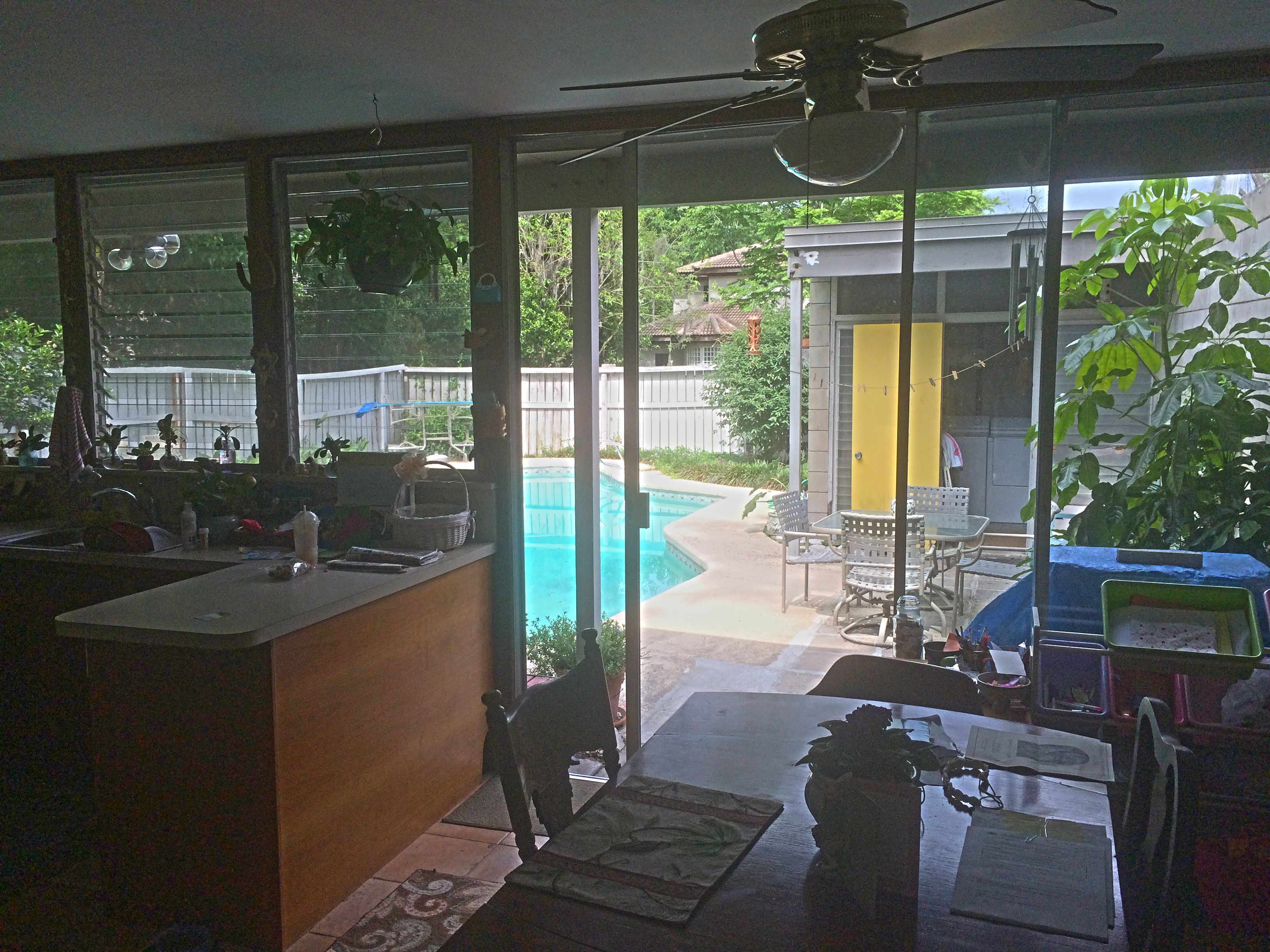 The kitchen / dining area looking out to the courtyard. My father’s house in Winter Haven has an 8-foot concrete block wall instead of a wooden fence.