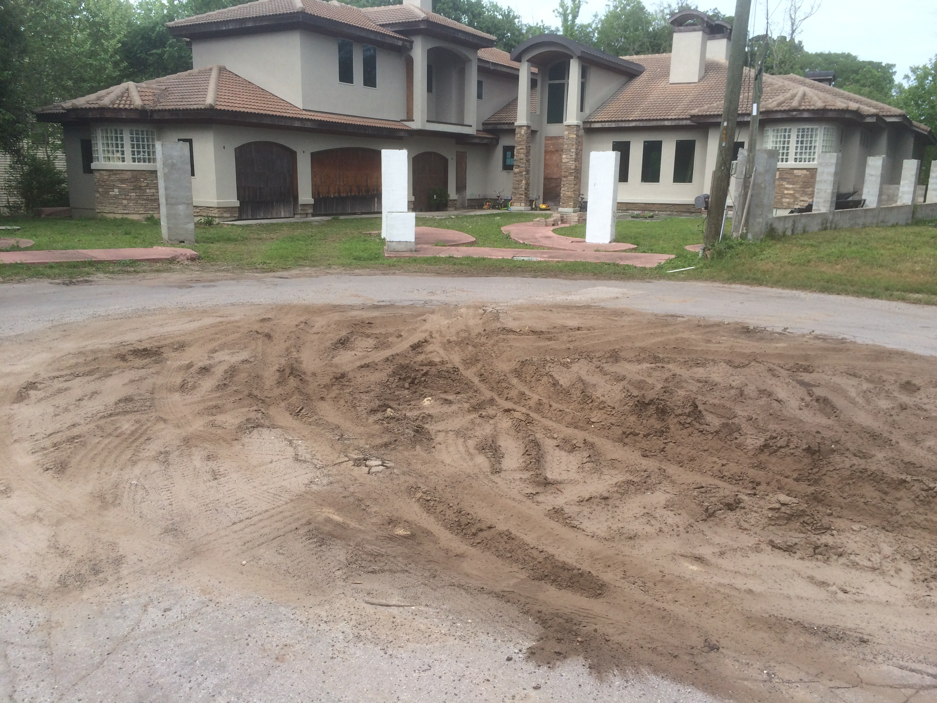 The bank foreclosed McMansion across the street. Betty says someone has already purchased it and is planning to make repairs. Notice the mess made in the cul de sac.