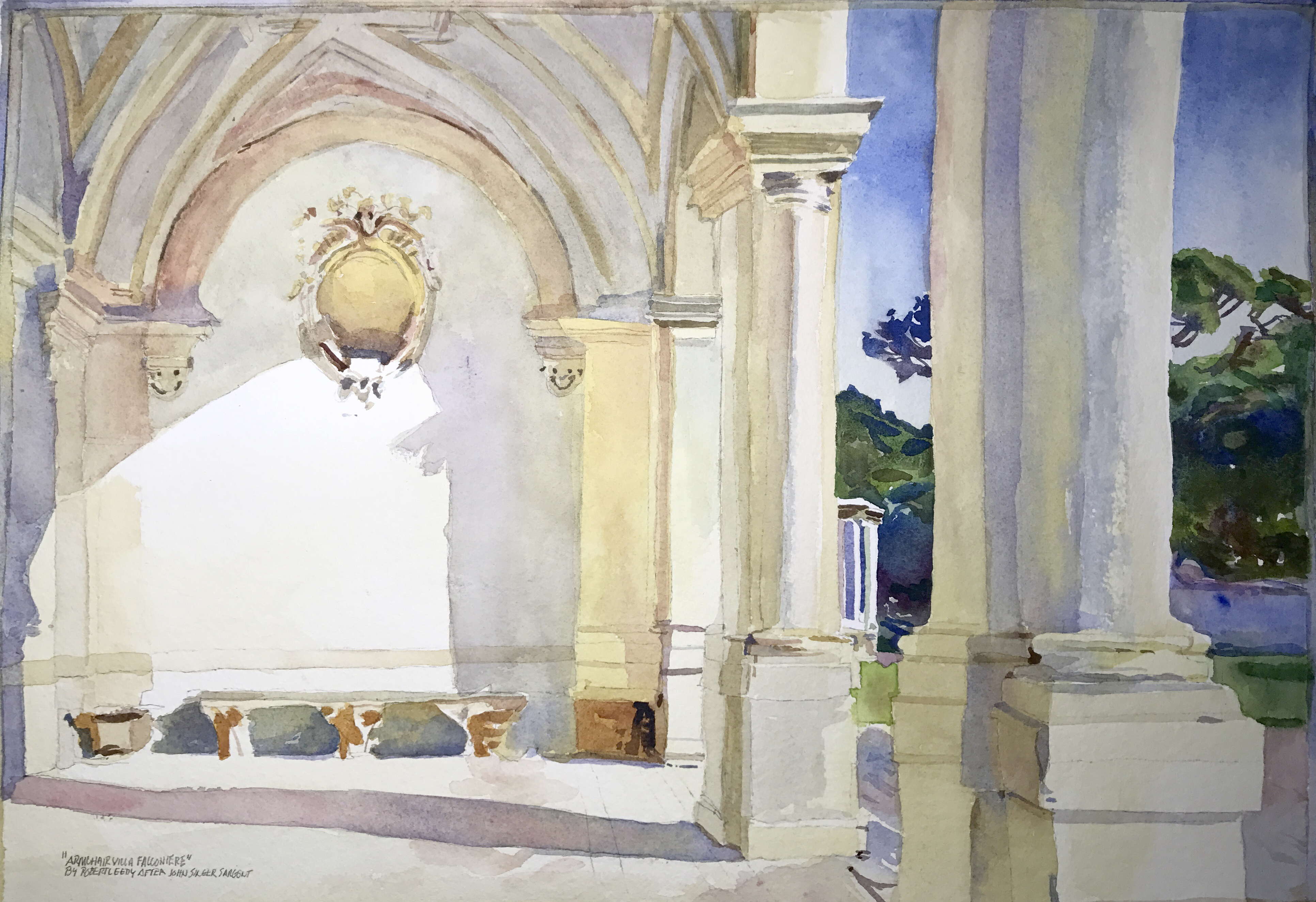 “Armchair Villa Falconiere by Robert Leedy After John Singer Sargent”, watercolor on Arches 300 lb. Cold Press paper, 15″ x 22″