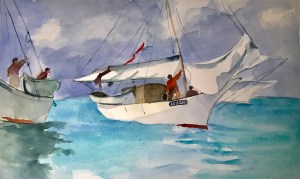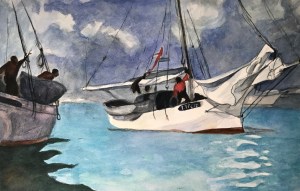 Robert Leedy, after Winslow Homer’s “Fishing Boats, Key West, 1903″, watercolor on paper, 18″ x 28 3/4”. [To be auctioned off beginning November 25, 2017. SEE BELOW.]