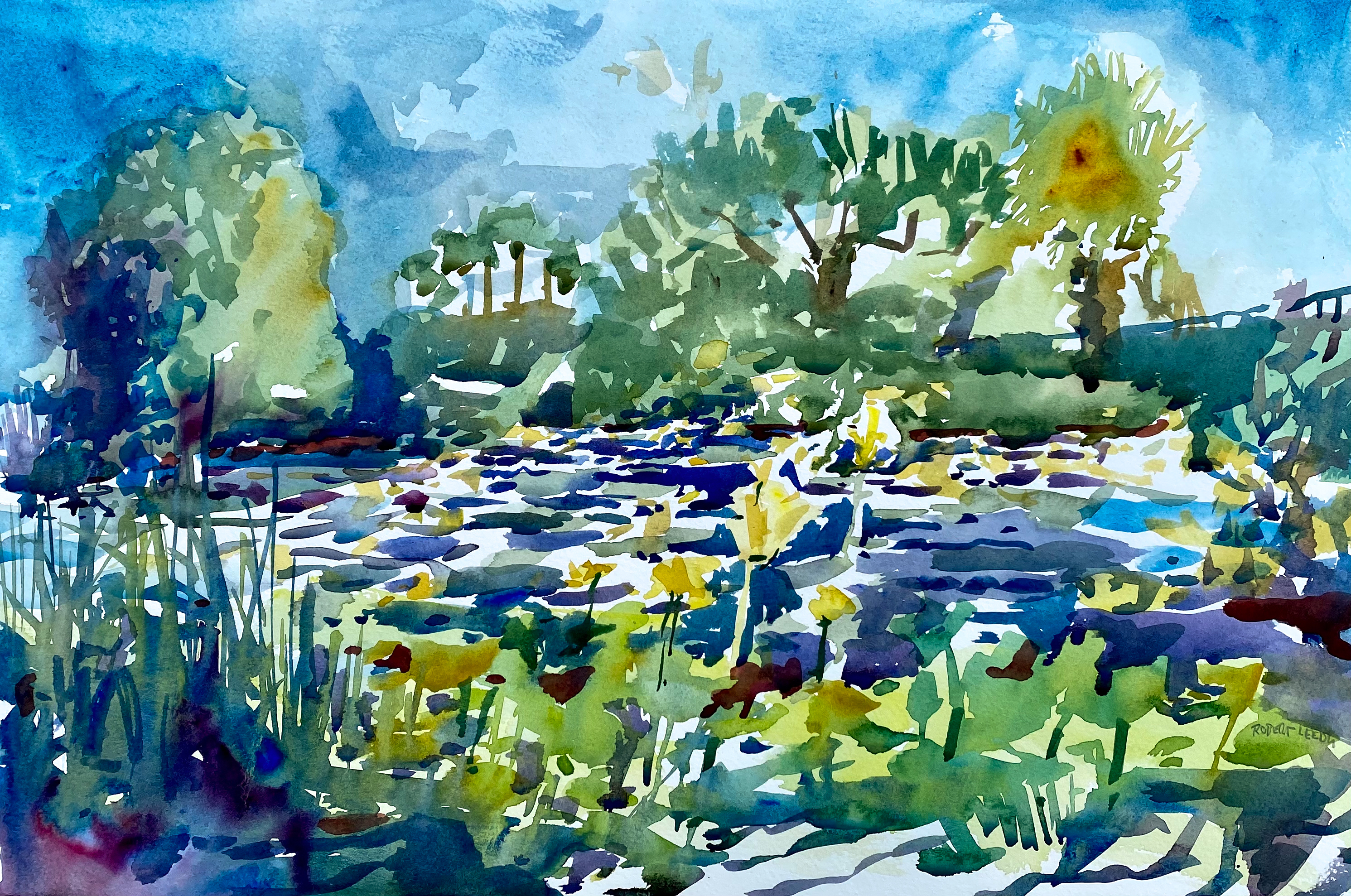 “Highway Oasis II”, by Robert Leedy, watercolor on Fabriano Artistico 140 lb. Cold Press paper, 12″ x 18″. This was my first painting on site.